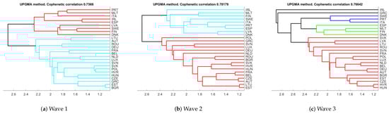 In Figure 9, we give the hierarchical clustering representations obtained from the robust distance measure, for the three waves. Cophenetic correlation coefficient is also provided as a measure of distortion between original distance and the ultrametric distance. This coefficient took a minimum value of 0.75 (attained in the first wave) and a maximum of 0.78 (in second wave), meaning that there is a high degree of coherence between both metrics.