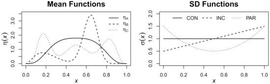 Figure 1. Simulation design functions. (Left): the three mean functions from Grace Wahba [34]. (Right): the three standard deviation functions: constant (CON), increasing (INC), and parabolic (PAR).