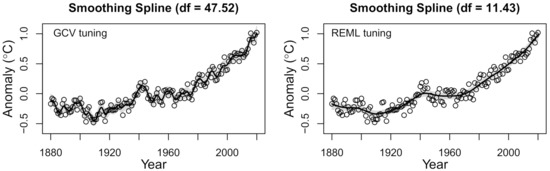 Figure 4. Global warming results. Smoothing spline solution for temperature data using GCV tuning (left) and REML tuning (right). Created using the ss() function in the npreg R package [48].