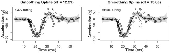 Figure 5. Motorcycle accident results. Smoothing spline solution for motorcycle data using GCV tuning (left) and REML tuning (right). Created using the ss() function in the npreg R package [48].