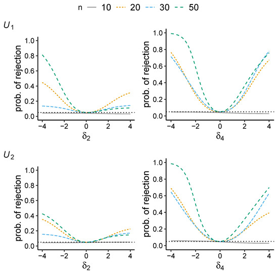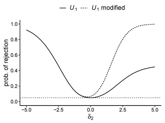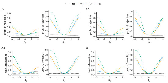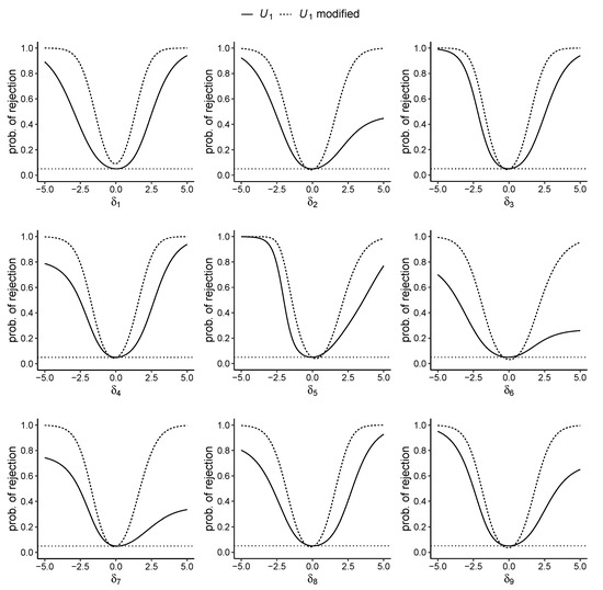 For the presentation of results and performance of the tests, respectively, the conditional power function given by (10) is considered. It is suitable for evaluating the tests with respect to a potential bias and power. Note that for a test to be unbiased its power function must be when the hypothesis (5) is true, and it must be when the alternative (6) is true. The complete conditional power (10) is a function of multiple parameters (when ). Therefore, the diagrams to be presented in the sequel display the power curves as a function of one parameter at a time while all respective others are set to 0. Thus, they only show the local power of the tests.