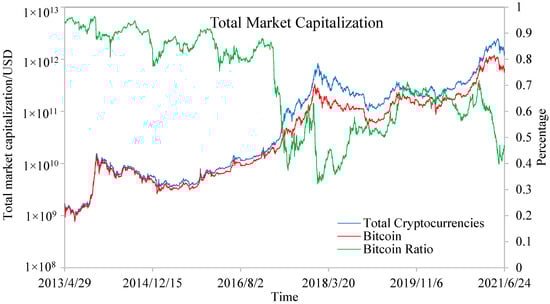 In recent years, the cryptocurrency market has seen explosive growth and roller coaster volatility, attracting widespread attention from not only the investment community but also the academic community. Unlike the existing central banking systems, cryptocurrencies are decentralized digital currencies that can be traded through a distributed ledger blockchain network without intermediaries. The first cryptocurrency is Bitcoin, invented by pseudonymous Satoshi Nakamoto in 2008. It is based on the proof-of-work decentralized consensus mechanism using the SHA-256 hashing algorithm and was released on 3 January 2009 [1]. Since the Bitcoin code written in C++ is open source, other cryptocurrencies, often referred to as altcoins, have been swiftly produced by modifying certain features of the Bitcoin code on issuance, security, and governance functions, leading to the boom of the global cryptocurrency market with the number of cryptocurrencies (https://coinmarketcap.com (accessed on 22 July 2021)) growing from merely 7 in April 2013, to an incredulous 10,668 in June 2021. The total market capitalization of cryptocurrencies reached a new historical record high of $2.481 trillion on 12 May 2021, accounting for about 2.3% of the global equity markets valuated at about $107.15 trillion [2]. From its baseline of $826.365 million on 6 July 2013, the total market value of the cryptocurrencies has increased by about 3000 times in less than 8 years (Figure 1).