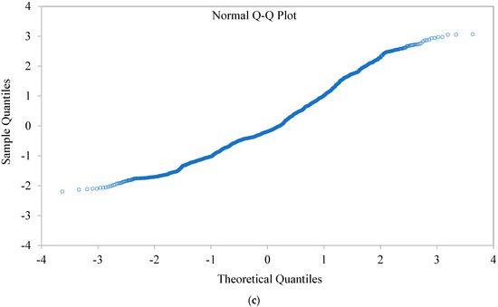 Evolution of the daily price trajectories of Bitcoin from 13 September 2011 to 24 June 2021, along with the regression line: (a) Bitcoin daily price trajectories and regression line; (b) externally studentized residuals versus the corresponding fitted logarithm value of Bitcoin price; (c) the normal Q-Q plot of the externally studentized residuals.