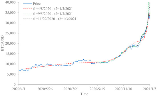 In this section, we used the daily data of Bitcoin price trajectory by moving the endpoint from 1 December 2019 to 24 June 2021 to detect positive bubbles associated with upwardly accelerating growth and vulnerable to regime change in the form of a crash or a significant reduction in growth rate, and negative bubbles associated with the downwardly accelerating decrease and susceptible to regime change in the form of a valley or a distinct reduction in decreasing rate. The length of fitting windows with an interval of 5 days is shrank from 650 days to 30 days, which is roughly from two years to one month. Figure 3 presents three typical fitting examples with a common endpoint = 3 January 2021, and three different sets of starting time: = 8 April 2020, = 5 September 2020, and = 29 November 2020—corresponding to the long, middle, and short time scale windows, respectively. The estimated parameters of the LPPLS model on the three typical fitting windows are shown in Table 1.