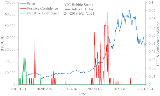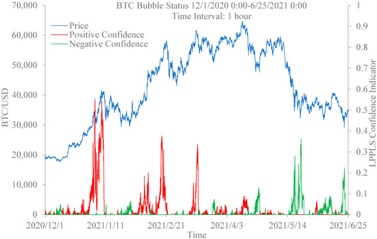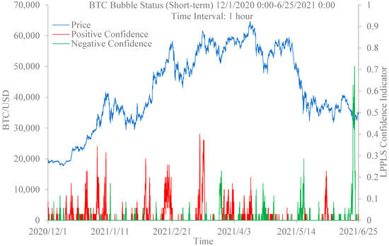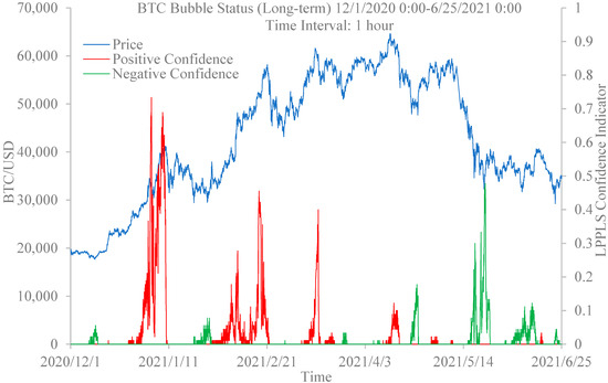 Figure 8 shows the hourly LPPLS confidence indicator for positive bubbles in red and negative bubbles in green along with the Bitcoin price in blue from 0:00 on 1 December 2020 to 0:00 on 25 June 2021. We can see that the hourly LPPLS confidence indicator can provide useful bubble diagnosis during the stage of dramatic price fluctuations and rapid state changes, which cannot be provided by the daily LPPLS confidence indicator.