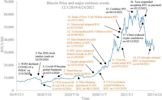 One of the interesting findings in Figure 4 is that from mid-January 2021 to June 2021, the LPPLS confidence indicator has few separate values of 0.8%, indicating the Bitcoin’s price trajectory did not show the obvious endogenous bubble patterns during the boom period from 27 January 2021 with a price of $30,424.62 to the historical peak of $63,564.48 on 13 April 2021, an increase of 108.9% in three months. Thus, from the perspective of two-year daily data, the bubble formed during the boom period from mid-January to mid-April is less likely to be endogenous and may not stem from the self-reinforcement of cooperative herding and imitative behaviors of market participants. In contrast, the price spike during this period may be driven by the exogenous events, such as a significant acquisition—when Tesla disclosed that it has purchased $1.5 billion worth of Bitcoin on 8 February 2021 [42], and a notable currency adoption—when the Bank of New York Mellon on 11 February 2021 announced that it would start financing Bitcoin and other digital currencies, which was considered to be a validation of cryptocurrencies from a key bank [43]. In addition, between 8 May 2021 and 23 May 2021, the Bitcoin price plummeted from $58,984.75 to $34,706.79, a 41.2% drop in about two weeks. However, there was no negative LPPLS confidence indicator during the crash, indicating that this crash was caused by external shocks. For example, Elon Musk took back Tesla’s commitment to accept Bitcoin as payment on 12 May 2021 and the Chinese financial institutions and businesses were banned to accept cryptocurrencies or use them to provide services [44]. Figure 5 presents the timeline of the main extrinsic events that might have affected the price of Bitcoin with the details of these events further tabulated in Table 2.