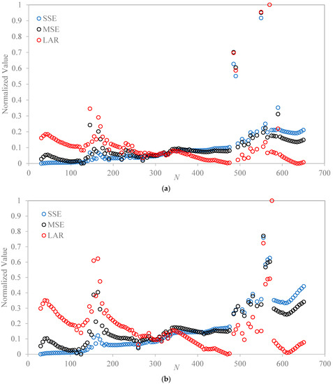 Figure 6 shows three different goodness-of-fit measures for the shrinking fitting window in two different situations: (a) outliers are not removed, which is obtained based on the original Lagrange regularization method; and (b) outliers are removed, based on the modified Lagrange regularization method. The three measures include the sum of squared errors (SSE) , the mean squared errors (MSE) , and the Lagrange regularization term (LAR) . For comparison, all three measures in Figure 6 are normalized. The X-axis label represents the number of data points in each fitting window or the length of each fitting window.
