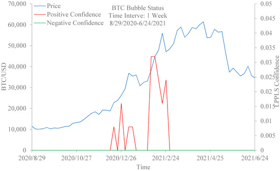 Two clusters of positive bubbles in Figure 7 formed between 17 December 2020 and 11 January 2021, and between 5 February 2021 and 25 February 2021. The weekly confidence indicator reached the peak value of 3.2% on 5 February 2021 and 10 February 2021, respectively, indicating that the significant signatures of the LPPLS model presented in the Bitcoin price trajectory in February 2021 and the Bitcoin price boom in February is an endogenous bubble. In this bubble regime, the Bitcoin price soared from USD 33,141.38 on 31 January 2021 to USD 55,936.04 on 20 February 2021—an increase of 68.78%. It should be noted that the results of weekly confidence indicator may not be consistent with that of the daily confidence indicator (e.g., the Bitcoin price boom in February based on daily confidence indicator in Figure 7 did not present the obvious endogenous bubble patterns), while it was characterized by clear endogenous bubble patterns based on weekly confidence indicator in Figure 7. This phenomenon is reasonable since an asset price trajectory exhibiting a super-exponential growth in a long-term scale may experience an exponential growth in a short-term scale, and vice versa.