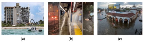 (a) Condominium collapse in Miami due to flooding (Courtesy of: Miami Herald); (b) Subway/streets flooding in New York City due to Hurricane Ida (Courtesy of: New York Post); (c) New Orleans flash flood (Courtesy of: Washington Post).