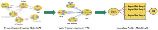 The proposed sea-level change analysis pipeline with three sequential steps: (1) a dynamic Structural Equation Model (SEM) to identify pathways between the global mean sea level (GMSL) and various predictors, (2) a Vector Autoregression Model (VAR) to quantify the GMSL changes due to the significant relations identified in the first step, and (3) a Generalized Additive Model (GAM) to model the relationship between regional sea level (RSL) and GMSL.