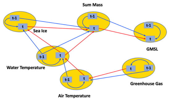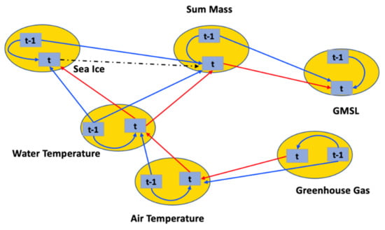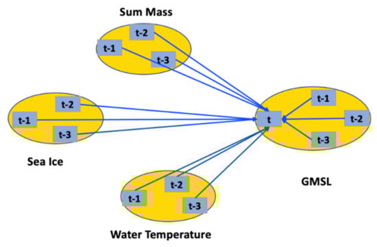 The inherent relationship between GMSL and predictors such as glaciers, ocean circulation, and thermal expansion is not fully understood. Several recent studies were proposed in an attempt to simplify the relationship [,]. These approaches are able to recognize a trend or inherent relationship, but an estimate of the underlying causal pathways for long-term projection of GMSL is not given. Some researchers made predictions within the next 100 years [,,]. Based on these studies, the GMSL rise by 2100 is estimated to be in the range between 60 to 130 cm. However, such models are either overly simplified, lacking the incorporation of essential causal relations, or overly complicated, featuring sophisticated atmospheric and climate models that can only be shown as a black box. This is a significant gap between existing analyses and public comprehension—and hence public actions.