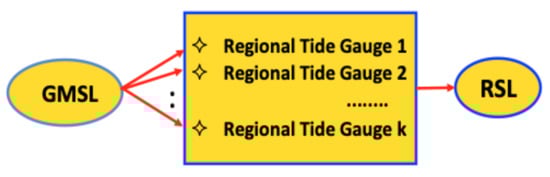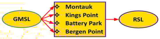 We analyzed regional tidal gauges located in areas of New York City and Long Island, Miami, and New Orleans. Using the generalized additive model (GAM), we modeled the relations between Global Mean Sea Level and Regional Sea Level (RSL). The RSL data for each region of interest are obtained by averaging the observed RSL from multiple regional tidal gauge stations. For instance, the RSL of New York City and Long Island is obtained from the Montauk, Kings Point, Battery Park, and Bergen Point tidal gauge stations. The related path diagram for this GAM analysis is shown in Figure 9.