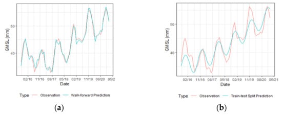 (a) Predicted numerical results for walk-forward validation method by VAR(3); (b) Predicted numerical results for train-test split validation method by VAR(3).