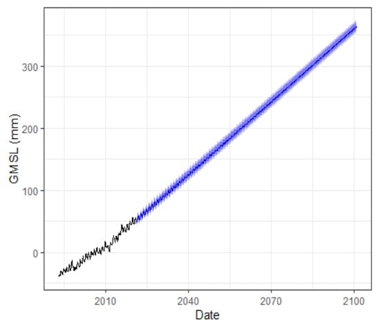 GMSL from 2021 to 2100 predicted by the VAR(3) model using the observed data (January 1993–May 2021) with the 80% (darker blue area) and the 95% (lighter blue area) prediction interval bands.