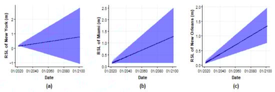 The blue area represents the prediction intervals. (a) Predicted regional sea levels of New York City; (b) Miami and (c) New Orleans over the next 80 years.