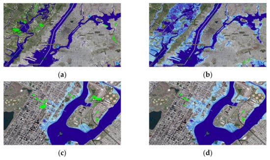 Light blue regions indicate areas of sea-level inundation. (a) New York City and vicinity with sea level in 2021; (b) and the extent of extreme flooding due to sea-level rise by 2100; (c) show significant flooding pictured in the Central Park region of Manhattan, New York by 2050 and (d) 2100.