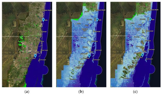 (a) Here we show sea level at the present day (2021); (b) predicted extreme flooding by 2050 and (c) 2100 in Miami, Florida, and surrounding cities.