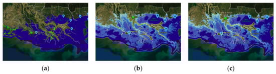 Here we show sea level (a) in 2021; (b) and predicted extreme flooding by 2050; (c) and 2100 in New Orleans, Louisiana and vicinity.
