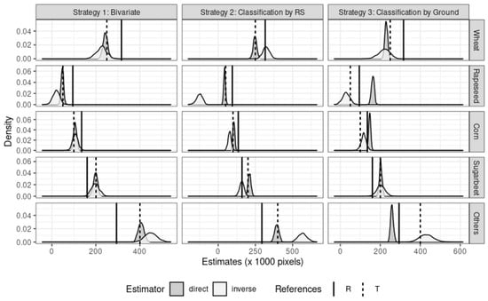 The analysis of the results under the RS strategy must consider the fact that the confusion matrix was built based on a multinomial product selection of points per image classification. Hence, when analyzing the results in Figure 1, only the direct estimator makes sense to be calculated. For all crops, the estimates provided by the direct estimator represent an improvement over estimates provided by , based on pixel counting in the sense that it redresses considerably the bias. For wheat, rapeseed, and others, the direct estimator shows smaller bias than for corn and sugar beet. The use of the inverse estimator is not appropriate in this scenario, and one can see that its performance does not represent improvement over the estimates.