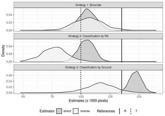 Continuing to analyze Figure 2, if the RS strategy is adopted, then only the direct estimator is theoretically justified. Indeed, the bootstrap distributions show that only the direct estimator was able to redress considerably the bias for corn area estimates compared to the estimate based solely on pixel counting . On the other hand, if the G strategy is adopted, only the use of the inverse estimator can be justified. Indeed, one can see that for the G strategy, the performance of the estimators shows that only the inverse estimator was able to diminish bias for corn area estimates. In such case, the inappropriate use of the direct estimator leads to an increase in bias. It should be noted, however, that only the G strategy has an appeal to be used in practice, as argued in Section 3.