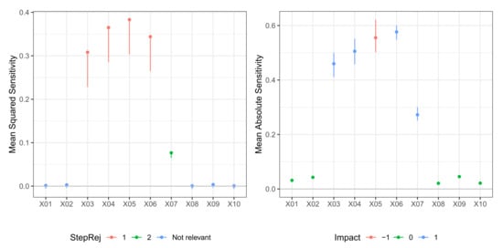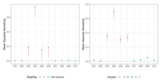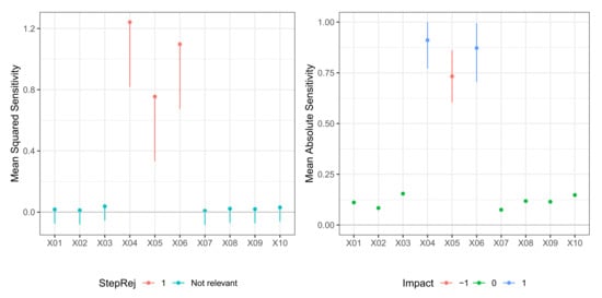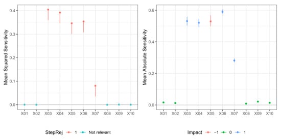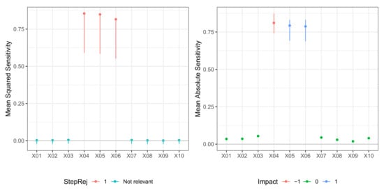In Table 5, we report the result of the -FWE testing procedure with and for a dataset generated from Model M3 (Friedman). Here, the number of neurons in the hidden layer was again not known, so both hidden layer size and weight decay were selected via 10-fold cross-validation. In this case, the test procedure could correctly identify the true relevant variables set for both and , but it required two steps for . A plot of the sequential -FWE testing procedure is reported in the left panels of Figure 5 and Figure 6. In Table 6, we report the values of mean sensitivity and mean absolute sensitivity, and the limits of the bootstrap confidence intervals with nominal level . Again, confidence intervals are only reported for the relevant variables and depicted in the right panels of Figure 5 and Figure 6. There was some cancellation effect on the mean sensitivity measures with values of the statistic very close to zero. However, both mean absolute sensitivity and mean squared sensitivity correctly identified the relevant variables. In any case, in different datasets, the sign of those metrics very close to zero does not deliver unambiguous information.
