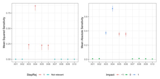 If is the identity function, , and is the mean sensitivity, that is, the arithmetic mean of first-order derivatives of the target variable with respect to the input variable. This is a popular sensitivity measure used in many applications. In that case, the testing procedure could in principle easily be adapted by considering two-sided alternatives and including absolute values of the test statistics and of the bootstrap replicates. However, if cancellation effects arise, the test procedure may be misleading.