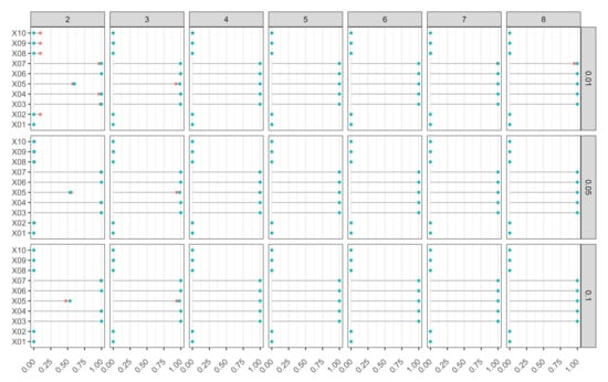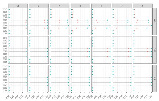 In Figure 9, we report the percentage of rejections for each variable in set for Model M3. The ideal plot is one where those percentages are equal to 1 for those variables that are relevant to model , and equal to 0 for those variables that are irrelevant. Again, the most difficult variable to identify was the one with a radial structure (). In all other cases, the procedure again appeared to be quite robust, delivering excellent performance for several combinations of m and .