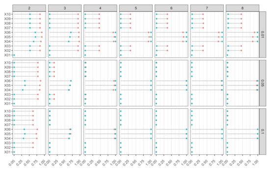 In Figure 8, we report the percentage of rejections for each variable in set for Model M2. The ideal plot is one where those percentages are equal to 1 for those variables that are relevant to model , and equal to 0 for those variables that are irrelevant. In the case of serious underfitting (), the procedure clearly failed to correctly identify the set of relevant variables, even by increasing both sample size and weight-decay value. By increasing the hidden layer size, there were several combinations of m and that produced excellent results, confirming the robustness of the input identification testing procedure by controlling k-FWE. All relevant variables had a radial structure, so the mean derivatives were close to zero due to cancellation effects. That may hinder their identification in presence of heavy underfitting or overfitting. However, underfitting can be easily solved by increasing the hidden layer size, while overfitting can be avoided using several strategies. The use of a penalized training function is just one example among many alternatives.