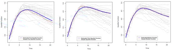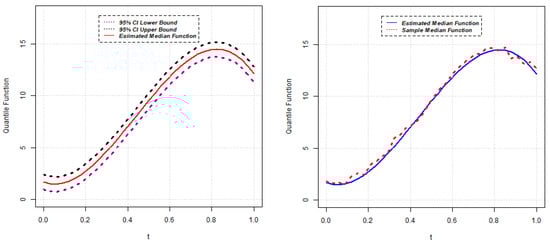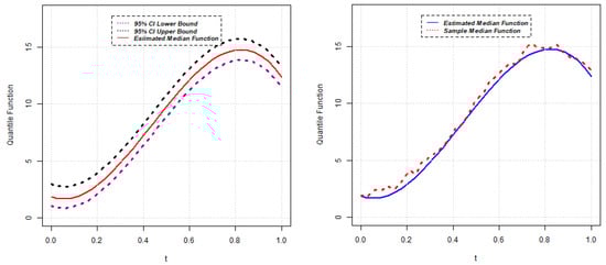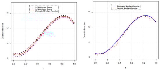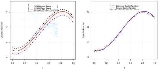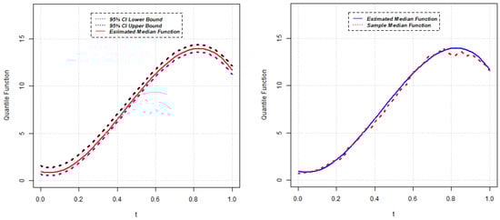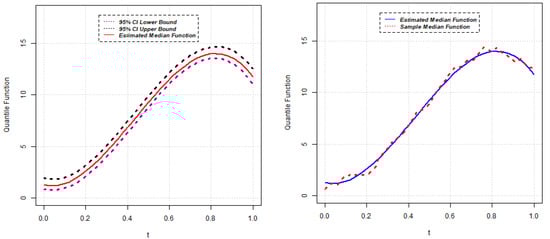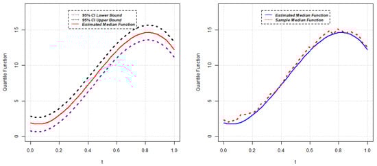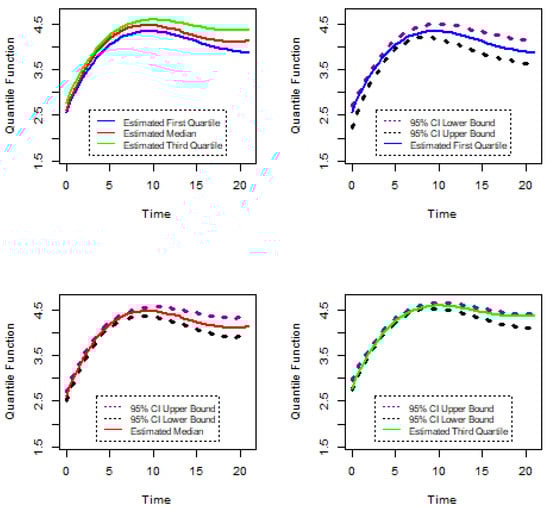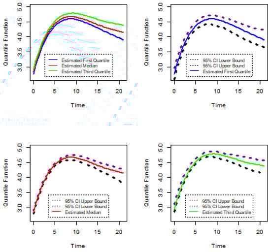 Now, the estimates of parameters for the quantile () of the random slope QR model are reported below for five different scenarios and estimated median functions; sample median functions, along with confidence intervals, are shown in Figure 6, Figure 7, Figure 8, Figure 9 and Figure 10.