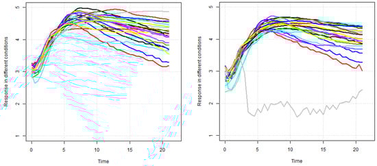 In this section, this research methodology is introduced to analyze the gene expression data. In most cases, for gene expression data, specific characteristics were measured at discrete timepoints and measurements were taken under different biological conditions. As gene expression characteristics were measured over a series of timepoints and repeated under different circumstances, the longitudinal data analysis method can be applied to analyze discrete gene expression data. On the other hand, gene expression measurements show a variety of patterns under different biological conditions over specific times. Therefore, the linear quantile mixed model may be appropriate for the analysis of gene expression data. Let be the observed measurement of specific gene expression under the i condition at time t. To determine the gene trajectory at different quantiles , the following quantile model for can be considered.