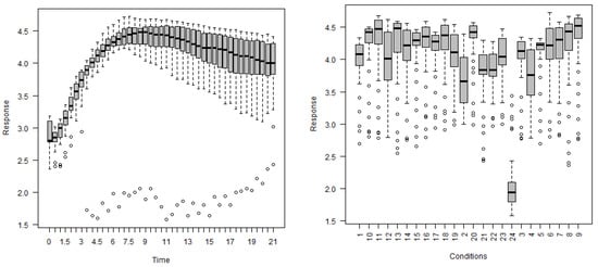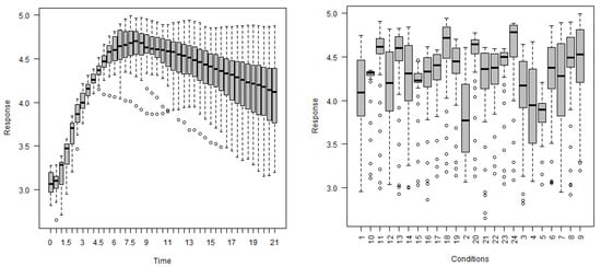 Let be the measurements for condition i at time t. The linear quantile mixed model is considered for estimation purposes. Since no additional covariates are available, polynomial basis functions are considered for fixed effects in this analysis.