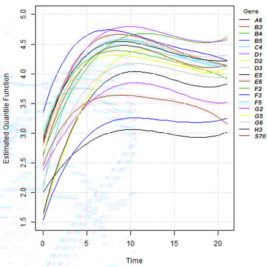 At present, the available literature only considers using the mean function when analyzing gene expression trajectory. However, when gene expression data are skewed or over-dispersed, the mean function can be affected by outlying observations. Normality is usually assumed as the error term for estimation of the parameters in the model, and this assumption may be improper in practical instances. In addition, the temporal gene expression curve generally shows a strong degree of heterogeneity between multiple biological conditions. As a result, the rates of change for gene expressions may be different in non-central locations, and the mean model can only characterize the central location of the gene expression distribution. Thus, mean function may not properly capture the gene expression trajectory. However, by fitting the gene expression curves at different quantile vaules, the quantile regression approach can be used to completely examine the gene expression rate. Many researchers have explored statistical methods for the analysis of the quantile regression model. Huang and Lee [11] predicted the quantiles of daily Standard&Poor’s 500 (S&P 500) returns by incorporating the high-frequency information through combining forecasts into one model. Most recently, Gallardo et al. [12] proposed a parametric quantile regression model for asymmetric response variables. Jung et al. [13] applied the multiple quantile regression method to the estimation of the spatial distribution of soil moisture. Chen et al. [14] studied estimation and inference for linear quantile regression models with generated regressors using a practical, two-step estimation procedure. Nevertheless, to our knowledge, there is no literature examining the gene expression data using the quantile regression model.