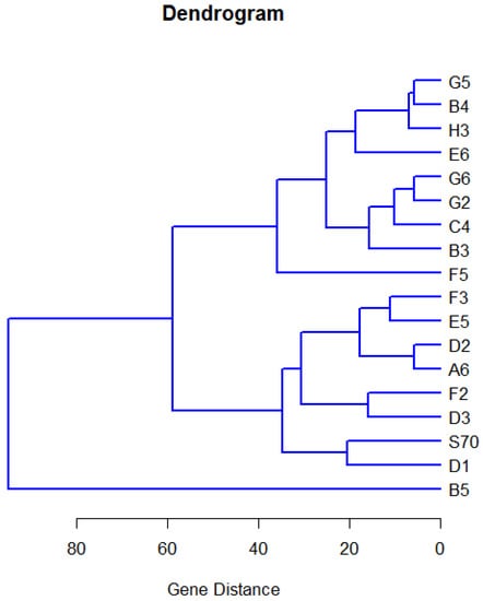 where and are the set of parameters for hth gene and sth gene. When holds, , Equation (19) has an asymptotic chi-squared distribution with degrees of freedom, where r is known as the basis of the regression model. Table 6 reports the Mahalanobis distance between 18 genes using the results of parameter estimates and chi-square statistic for . Moreover, considering a significance level of , Table 7 reports gene similarity. Figure 20 presents clustering tree of 18 genes in P. aeruginosa. Based on Figure 20 and Table 7, it can be said that PA1841(H3) shows no significant difference to PA2975(rluc)(B3), PA4991(B4), PA0573(E6), PA2997(F5) and PA1748(G5). In addition, the quantile function of PA3771(G6) shows no difference to the quantile function of PA0287(C4), PA0573(E6), PA0649(G2). Furthermore, PA3212(F3) shows similarities with PA5283(A6) and PA1875(E5).