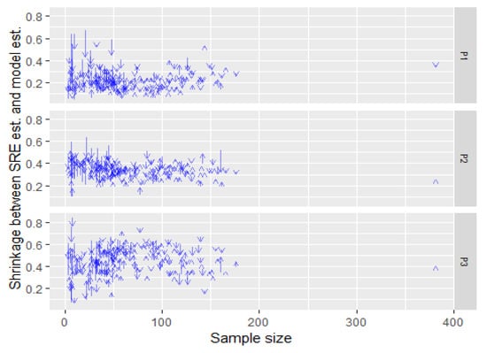 Literacy proportion—shrinkage plots of point estimates by sample size: 2012/2014/2017. P1: proportion at or below level 1; P2: proportion at level 2; P3: proportion at or above level 3.
