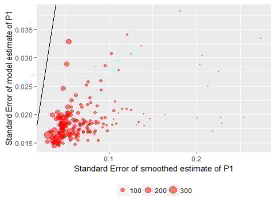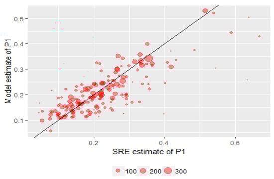 Furthermore, scatterplots of both the estimates and variance estimates were constructed to show the relationship between the survey regression estimates and the model predictions. As seen in Figure 3, for the estimates of the proportion of literacy at or below level 1, the majority of the points were around the 45-degree line, indicating that the model predictions were close to the SREs, and counties with larger sample sizes (i.e., larger bubbles) had closer estimates than those with small sample sizes.