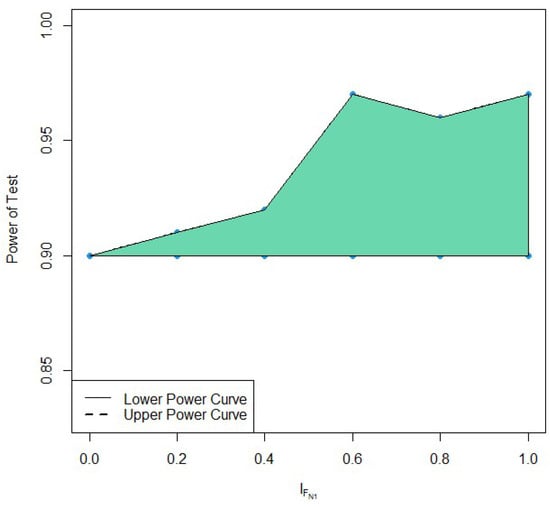 In Table 4 and Table 5 the first value when presents the power of the test under classical statistics. From Table 4 and Table 5, it can be seen that, as the values of increased, the values of the power of the test also increased. For example, from Table 4, it can be noted that the value of the power of the test was [0.90, 0.90] when and the value of the power of the test was [0.90, 0.97] when. The curves of power of the proposed F-test for counts are shown in Figure 1 and Figure 2. Figure 1 and Figure 2 also show that as the values of increased, the values of the power of the test also increased.