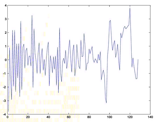 In the following example, we will consider a tdAR(1) process but with the innovation standard deviation being a periodic function of time. Let us first show a unique artificial series of length 128 generated by (1) with