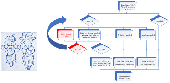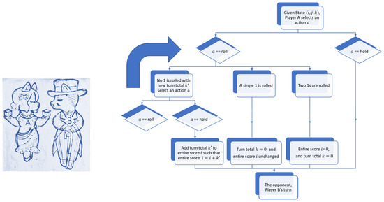 The dice game Pig was first documented in the book Scarne on Dice by the American magician John Scarne in 1945 [21]. There, Scarne introduced the one-die Pig game with a simple rule of play: Two players race to reach a certain point total, say 100 points, and the first one to reach the said total wins the game. At each turn, a player repeatedly rolls a die until either a one is rolled (and the player scores nothing for that turn and it becomes the opponent’s turn), or the player holds out of his/her own volition and scores the sum of all the rolls in that turn. That is, at any time during a player’s turn, the player is faced with two decisions: roll or hold. If the player rolls a 1, he/she must stop, and the turn total will be 0. If the player rolls a number other than 1, namely, 2 to 6, this number will be added to the turn total, and the player can again choose to roll or hold; if they choose to hold, it becomes the opponent’s turn. Pig is a “jeopardy dice game”, as one can jeopardize his/her previous gains by continuing to roll for greater gains (if the next roll is not 1) or ruin (if 1 is rolled) [22]. The one-die Pig game is simple, but the optimal strategy to play this simple game is not so simple and has only been solved in recent years using the Markov decision process and dynamic programming [23,24]. These authors even wrote an online interactive app so that people can play one-die Pig with the computer:http://cs.gettysburg.edu/projects/pig/piggame.html (accessed on 1 June 2022)