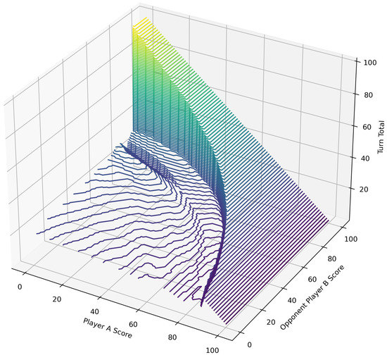 The standard two-dice Pig game can be solved using reinforcement learning, as we are interested in the long-term reward—winning the game. In particular, we can model the game process as an agent–environment interaction. Furthermore, the game can be viewed as an MDP as, given the current state, the action is independent of the past states. The state contains three elements: Player A’s entire score i, the opponent Player B’s score j, and the turn total k. Given such state s, Player A has two options: roll or hold. The roll action is coded as 1, while the hold action is coded as 0, i.e., . For any two states (not necessarily different) and any action , there is a transition probability such that taking action a will change the state from s to . The immediate reward on each transition from s to under action a is defined as , with if is a winning state, and if is a not-winning state. The winning state has the property because the player reaching the winning state can simply hold and then wins the game. Because the only situation obtaining the positive reward is winning the game, there is no discount factor () needed to ensure convergence.