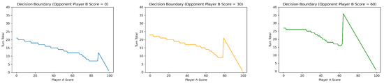 Figure 2 shows the roll/hold boundary for each possible state s. As Opponent B’s score approaches the goal of 100, Player A plays more aggressively on each turn, especially when Player A’s score is relatively low. On the contrary, when Opponent B’s score is close to 0, Player A plays conservatively. Figure 3 shows the decision boundary given Player A’s score when Opponent B’s score is fixed. For a better comparison, we combine these results in Figure 4 with the additional case of an opponent score of 90. This produces the same observation we mentioned above. At the extreme case of an opponent score of 90, Player A’s optimal strategy is to simply reach the goal of 100 in one turn, as Opponent B has a very high probability of winning the game in his/her turn.