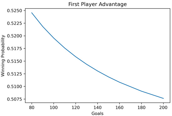 Intuitively, we believe that the player who goes first has some advantage. Figure 5 shows the winning probabilities of the first player, Player A, when the goal is increasing. Indeed, the first player has a certain advantage in terms of a higher winning probability, and such advantage vanishes gradually as we increase the goal. When the goal is 100, the winning probability for Player A is 52.18%, while the winning probability drops to 50.76% when the goal is 200. Detailed winning probabilities for the first player when both players play optimally are summarized in Table A1.
