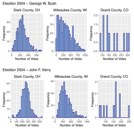 A classic example is precinct by precinct election data. Figure 1 provides such data from three counties from the 2004 US Presidential Election between incumbent President George W. Bush and Senator John F. Kerry. As is apparent in Figure 1, precinct level election data can be clustered thus rendering 1-BL 10 useless. As a result, work by Walter Mebane and others have looked at the second digit (hereafter referred to as 2-BL 10), or the last two digits (which one expects to be the same about 10% of the time base 10). For example, Mebane (2006) applied 2-BL 10 to election data from the state of Florida in 2004 US Presidential Election and the 2006 Mexican Presidential Election []. In subsequent research, Mebane (2009) applied 2-BL 10 to the 2009 Presidential Election in Iran to detect potential instances of malfeasance []. Mebane (2012) applied these techniques to German and American elections, discussing manifestations of coercion as well as effects of strategy and gerrymandering []. Although there have been some criticisms of the usefulness of Benford’s law [], Mebane (2011) responded to these criticisms arguing that 2-BL 10 does indeed have a reasonable degree of potential usefuless depending on the nature of the data analyzed and associated levels of aggregation []. There are many other applications of Benford’s law to election data as well [,,,,,,].