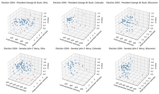 Maximum Likelihood Estimates and Goodness of Fit Test Results for Vote Counts for Selected Counties in 2004 US Presidential Election—President George W. Bush. p-values above 0.05 (plotted in blue) indicate conformance to discrete Weibull distribution.