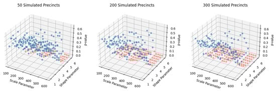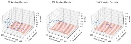 First Digit Base 3 Monte Carlo Analysis of Simulated Discrete Weibull Distributions with Various Choices of Parameterizations and Precinct Sizes Using Chi-Squared Testing. p-values above 0.05 (plotted in blue) indicate conformance to 1-BL 3.