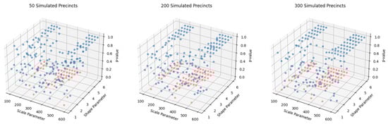 Specifically, based on the results presented in Figure 4, we simulated county level data with the number of simulated precincts varying between 50 and 300. We varied the scale parameter between 100 and 600 in increments of 25 and varied the shape parameter between 1 and 6 in increments of 1. After compiling the expected and observed number of first digits under both base 10 and base 3 representations, we performed chi-squared tests for both 1-BL 10 and 1-BL 3 (assuming under the null hypothesis of distributional equality, chi-squared distributions having eight and one degree of freedom respectively as discussed in Section 2) and subsequently computed associated p-values. We averaged these p-values over the course of 25 Monte Carlo simulations. Our results are presented in Figure 5 and Figure 6.