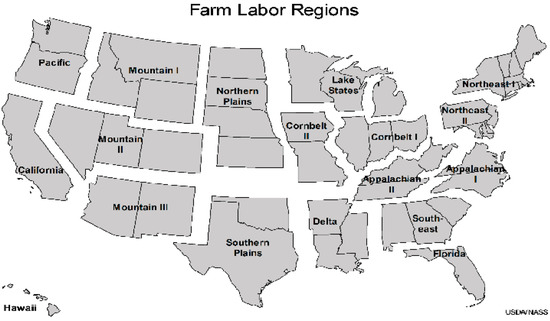 The survey provides the basis for the employment and wage estimates for all workers directly hired by U.S. agricultural operations (excluding Alaska) for each of the four quarterly reference weeks at the regional and national levels (see Figure 1 [9]). The quarterly estimates, in turn, provide the basis for the annual average estimates.