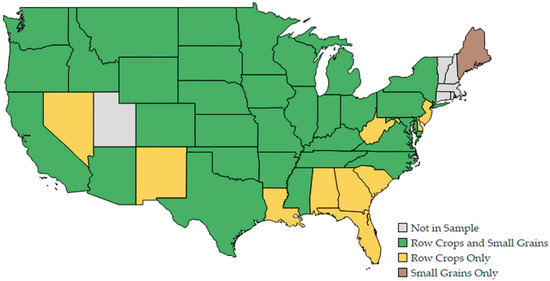 County-level crop estimates have been produced since 1917 [11]. Although initially federally funded, the program evolved into partnerships with the states via cooperative agreements. The crop surveys were usually funded by the states, with NASS staff in state offices defining the samples, identifying the processes, and developing the estimates. As the USDA’s support of the farm sector has evolved so that aid is increasingly conditioned on each producer’s own revenue experience, the NASS initiated the probability-based county agricultural production survey (CAPS) in a few states in 2011, and the remaining eligible states in 2012, to augment the agricultural survey for county-level estimates. The CAPS list frame sample is stratified by state and drawn using maximal Brewer selection with Poisson permanent-random-number (PRN) sampling, which is sometimes referred to as multivariate probability proportional to size (MPPS) sampling [12]. The MPPS design allows for target sample sizes for all commodities of interest to be set at the county level. The agricultural survey and CAPS samples are pooled and reweighted, and the combined sample is referred to as the CAPS sample. Sampling variances for crop acreage and production are estimated using a delete-a-group Jackknife and sampling variances for yield are estimated using a second order Taylor series approximation for the ratio [12,13]. The CAPS sample provides survey data with which to estimate the acreages and production of selected crops at the county level for use in state and federal programs in 44 states. County-level estimates of crop acreage, yield, and production inform many agricultural support and crop insurance programs administered by other USDA agencies including the Farm Service Agency and the Risk Management Agency, which manages the Federal Crop Insurance Corporation.