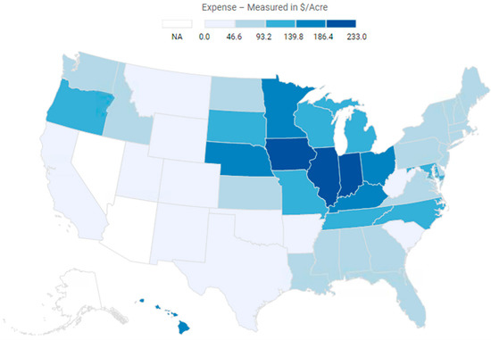 14. USDA NASS. 2021—Rent, Cash, Cropland, Non-Irrigated—Expense—Measured in $/Acre. Available online: https://www.nass.usda.gov/Data_Visualization/Commodity/index.php (accessed on 2 September 2022).
