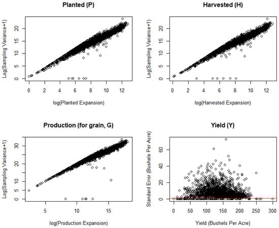 Often, direct point estimates from surveys are not reliable for areas with small sample sizes, and the corresponding sampling variances can also be imprecise and inaccurate [8]. The choice and accuracy of the existing techniques for small area estimation are dictated by the quality of the available data in terms of both survey responses and covariates (see [9]). The literature suggests different approaches under both frequentist and Bayesian frameworks to mitigate unreliable survey-estimated variances. One common approach, known as the generalized variance function (GVF), includes modeling survey-estimated variances against some function of the direct estimator and other covariates [10] to smooth the noise and make the variances stable. Researchers have proposed co-modeling of direct estimates from the surveys and their variances within a model. For example, Maiti et al. [11] used a frequentist framework, and Sugasawa et al. [12] considered a Bayesian approach, which was further extended by Gershunskaya and Savitsky [13] to include nonparametric probabilistic clustering. A hierarchical log-normal model was developed by Erciulescu et al. [14] to mitigate unreliable sampling variances that were strongly related to direct estimates. Then, the updated sampling variances were further used as input in a subarea HB model for producing the corn harvested acreage. The log-normal model is also used to smooth the survey-estimated variances of production totals since its assumptions hold for the production totals too. However, this model’s assumptions do not hold for the yield. In addition, exploratory data analyses do not indicate any relationship between the direct estimates of the yield and their sampling variances that could easily be modeled. It is not always easy to model the relationship between survey summaries (direct estimates and sampling variances) using classical approaches due to the confounding factors involved. One can use a Taylor series approximation under a subarea-level model, as shown in [7,14], to update the variances in the yield.