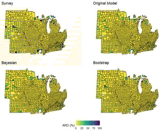 Table 2 shows the nationwide results using a five-number summary of the ARDs of the yield estimates produced from all four approaches, with a focus on the published estimates for the anomalous counties and all available counties afterward. The median of the ARDs when the Bayesian and bootstrap methods qwre applied in the anomalous counties were 7.93% and 6.71%, respectively. These were much smaller than the median ARD of the survey’s direct estimates and, to a lesser extent, smaller than the median ARD of the estimates produced from the original model in Equation (5). The estimates based on the Bayesian and bootstrap methods were generally closer to the published estimates in the anomalous counties. Similar relationships can be seen in the third quartile. However, the maximum ARD of the survey’s direct estimates was the smallest of all the other methods, and this was because some of the direct estimates from the survey were missing, and other methods provided a complete dataset. The median ARDs from the bootstrap approach were the smallest in the anomalous counties. The maximum ARD of the estimates produced by the Bayesian method was the smallest in the anomalous counties. In all counties, all modeled estimates were generally closer to the published estimates when compared with the direct survey estimates. Overall, Table 2 reveals an improvement in performance for the HB models in small areas under the two proposed approaches. All five-number summaries of the ARDs of the yield estimates based on the Bayesian and bootstrap methods were smaller than those from the original model.